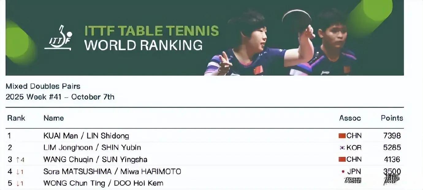 王楚钦/孙颖莎排行升至第三