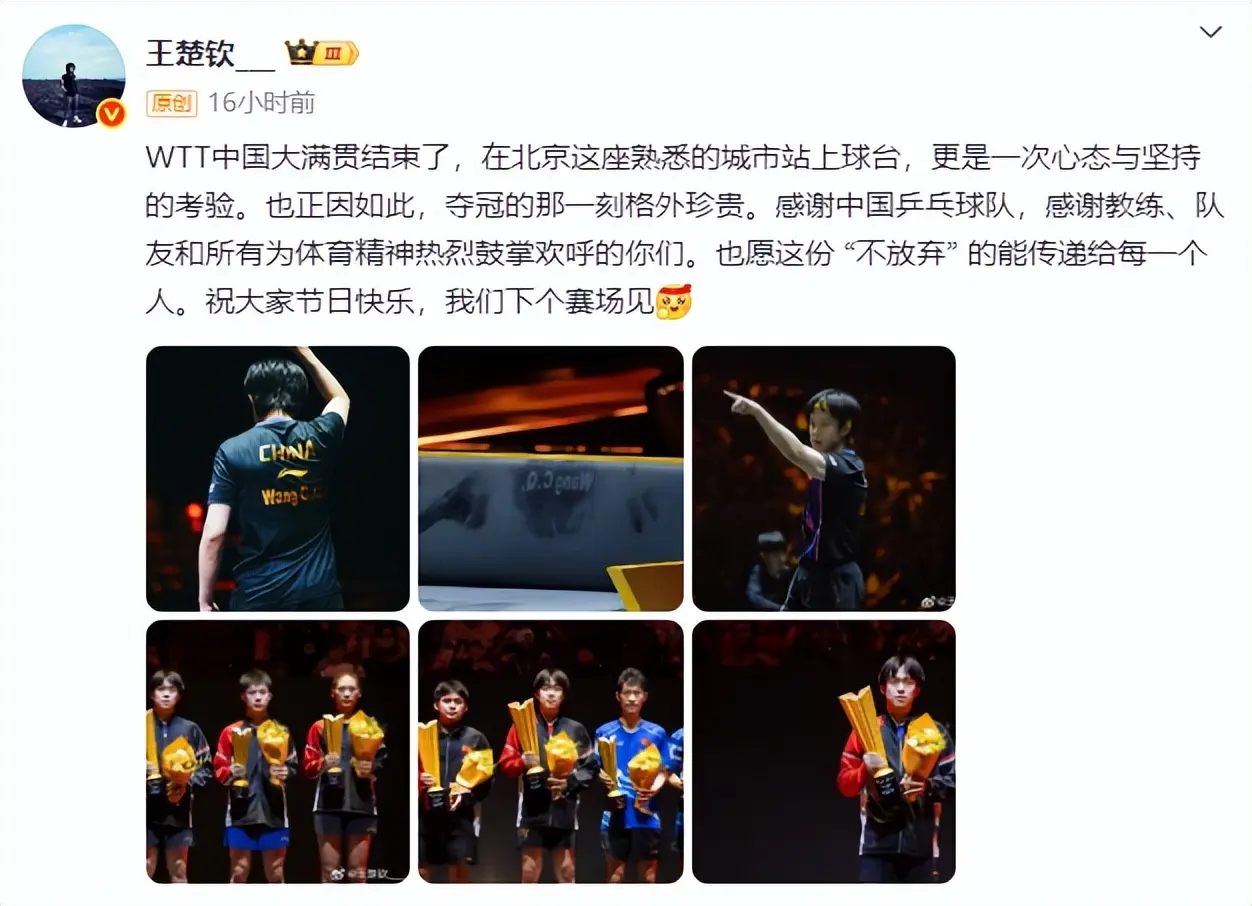 同期,王楚钦赛后发文示意:“在北京这座熟习的城市站上球台,更是一次心态与坚合手的考验”